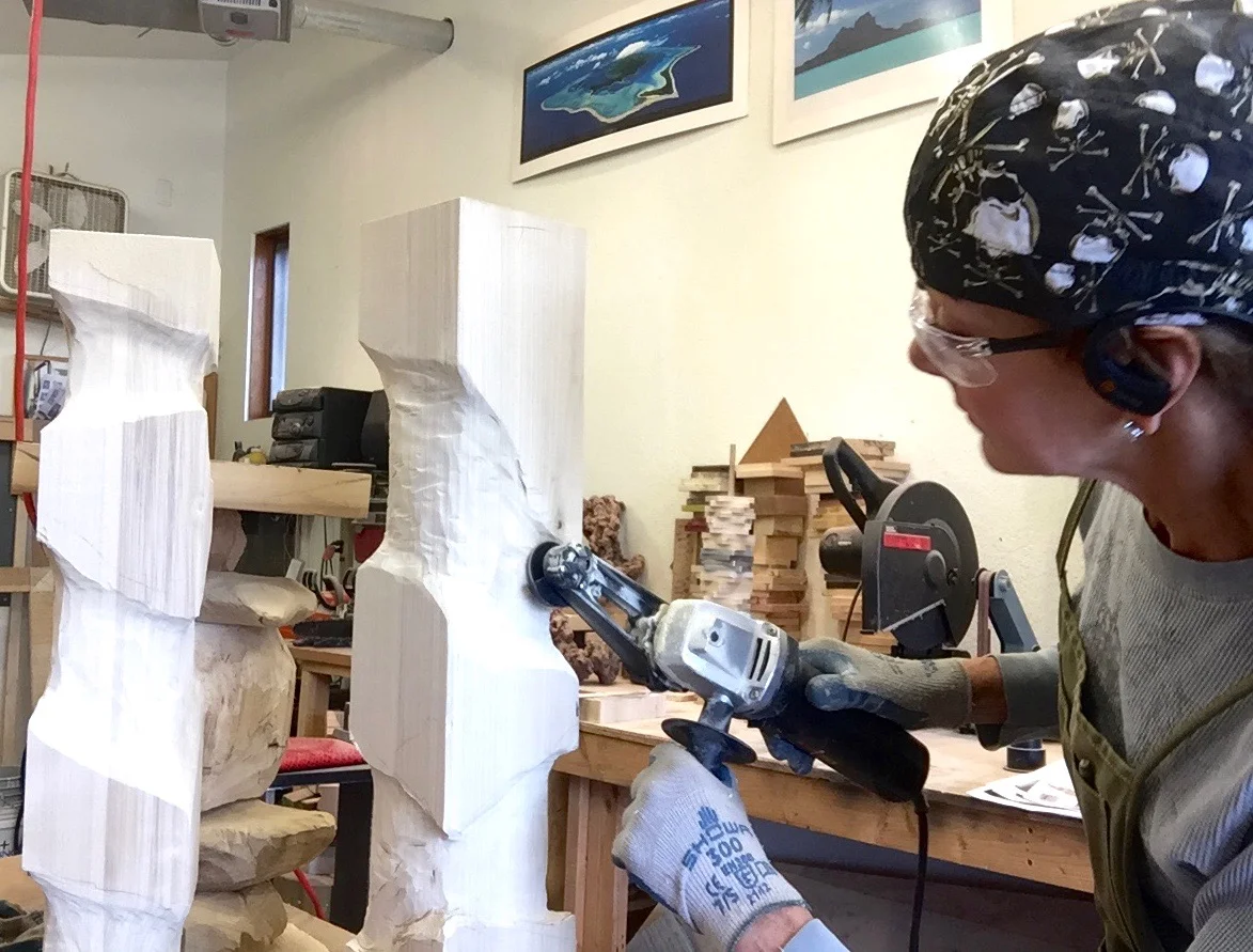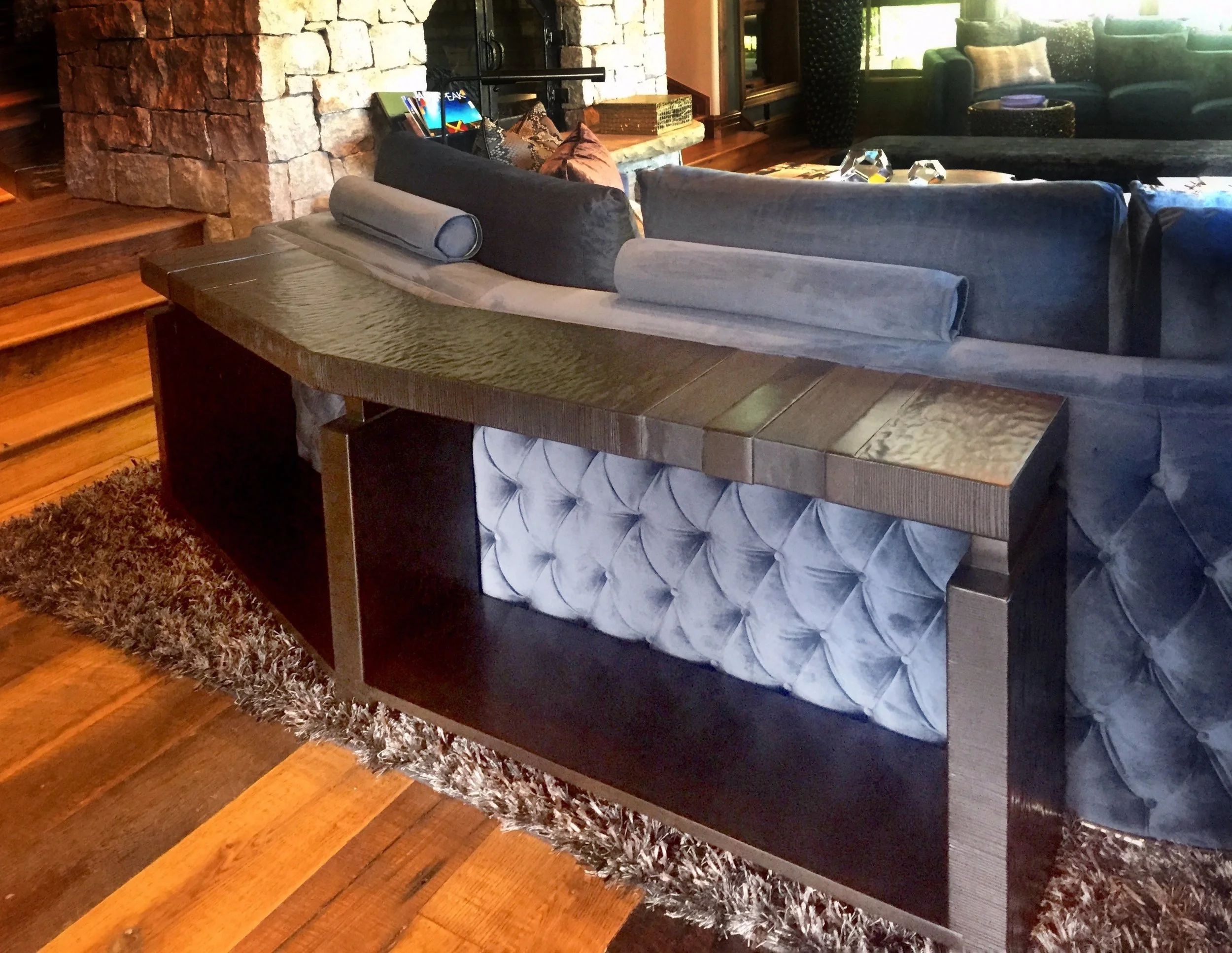Custom Shelf made of quarter sawn white oak, cerused and inlayed stainless steel accents.