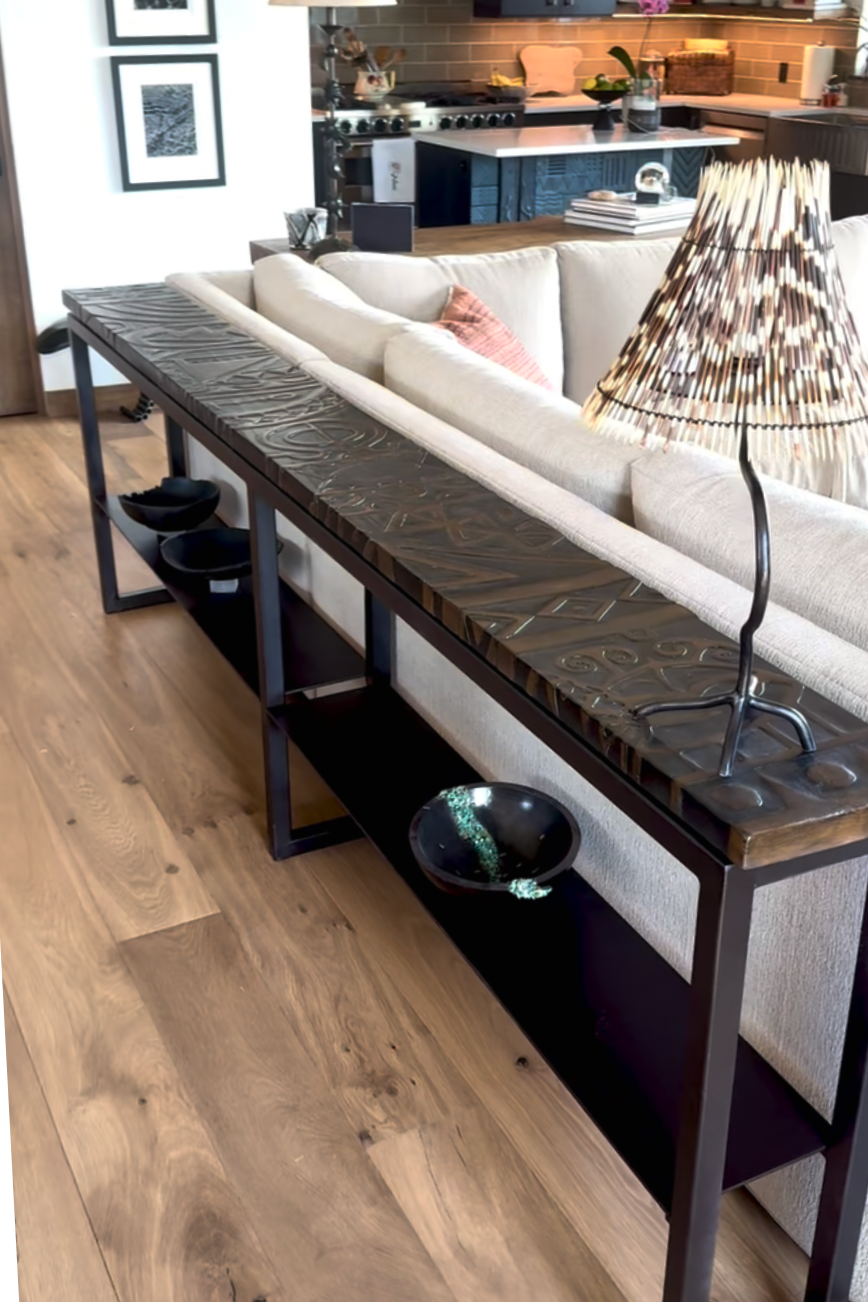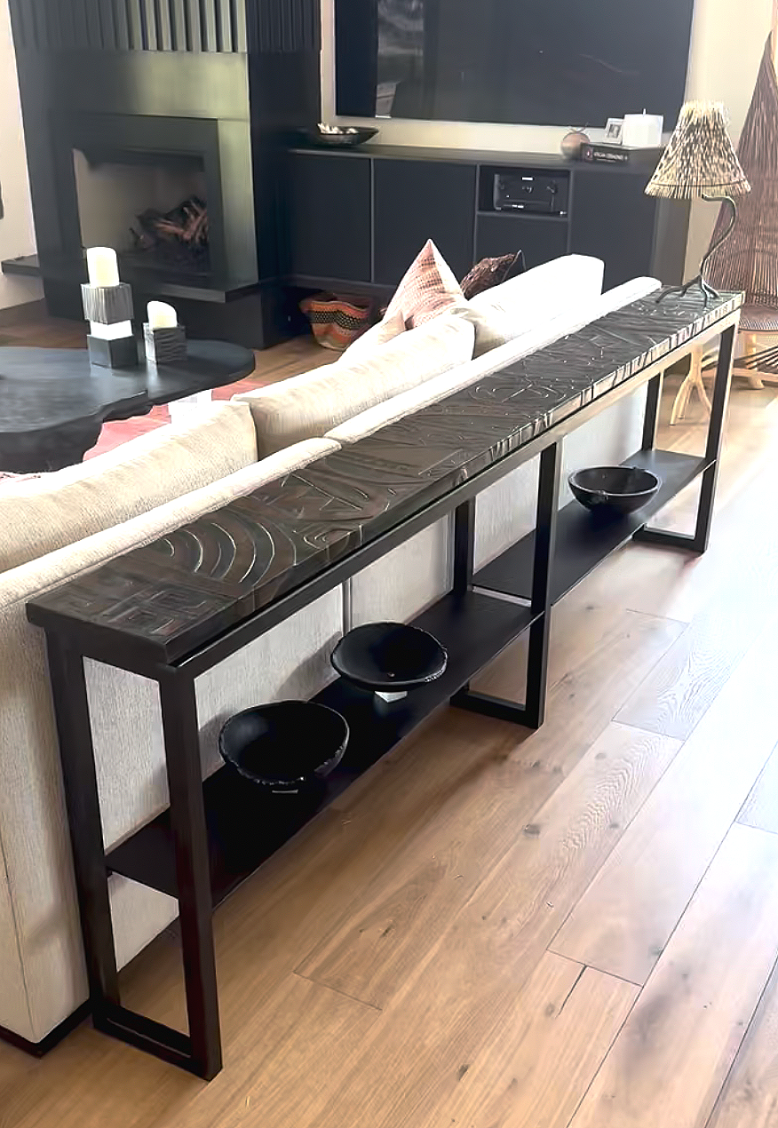 This console was carved using designs and patterns inspired by Maori tattoos. The solid wood top sits on a frame of steel with steel shelves.